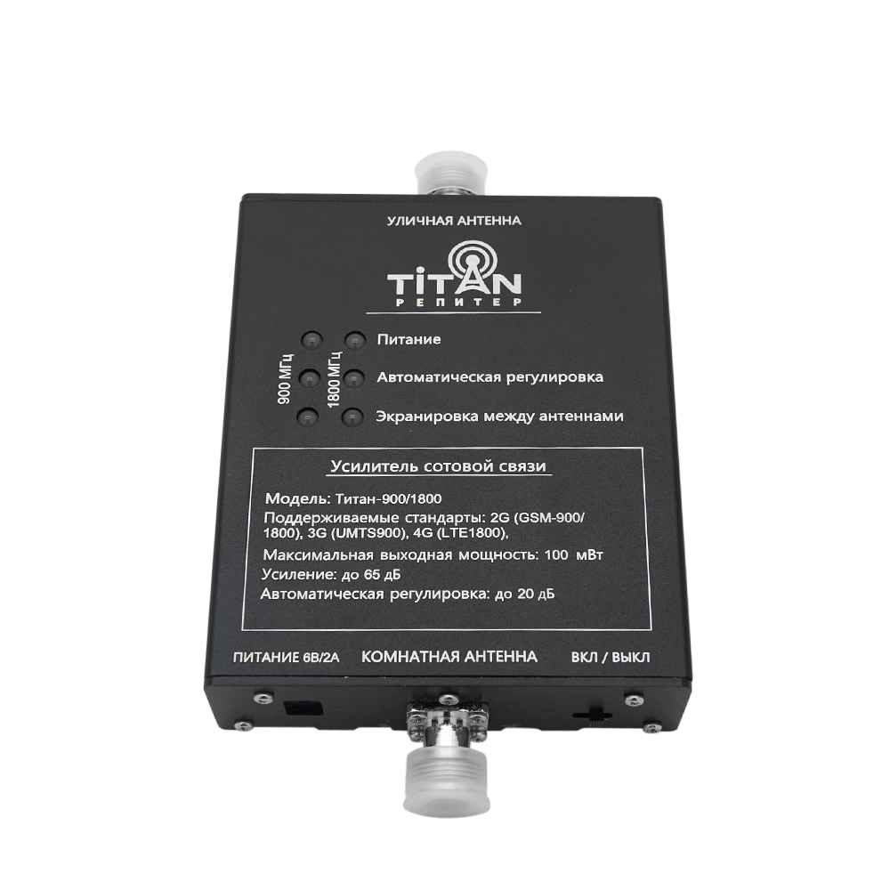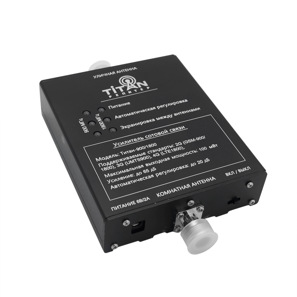 Усилитель сигнала связи Titan-900/1800/2100 комплект – трехдиапазонное оборудование, основной задачей которого является увеличение мощности сигнала сотовой связи. Подходит для применения внутри жилых и производственных помещений с высоким уровнем запыленности, так как корпус имеет защиту IP40. Прибор увеличивает сигнал связи или интернета до 78 дБ. Работает на площади до 350 кв.м. Активно используется на объектах, которые расположены далеко от вышек связи либо имеют много препятствий на пути прохождения сигнала. В набор входят усилитель в металлическом корпусе и две антенны, помещенные в пластиковый корпус.