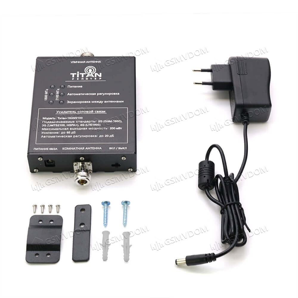 Усилитель сигнала связи Titan-1800/2100 комплект (LED) устанавливается в жилых и производственных помещениях с целью увеличения мощности выходного сигнала и его стабильной передачи на приемники. Комплект включает в себя двухчастотный усилитель в металлическом корпусе и две антенны в пластиковом кожухе. Применяется на объектах, где отмечаются проблемы со связью и интернетом, обусловленные наличием физических преград на пути распространения сигнала. Прибор эффективен на площади до 350 кв.м., максимальное усиление составляет 60 дБ. Предусмотрена защита от перегрузки и режима самовозбуждения.